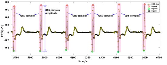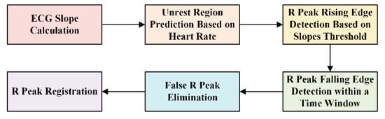 An ECG wave consists of many feature points, such as the QRS wave and its onset and offset, and the T wave. Each feature point might be significant for diagnosis. To evaluate the ECG signal and determine the optimal electrode location for wearable single-lead ECG monitoring devices, we must extract the QRS wave from the processed ECG. The R peak is relatively easy to identify, because it usually has the maximum value in the ECG waveform and the largest slope value. Additionally, the R peak is the basis of the detection of other features. We used the slope threshold detection method for QRS recognition [28], of which the block diagram is presented in Figure 10. Searching the local minimum points forwards and backwards from the R wave, we could find the adjacent Q and S points, respectively. Figure 11 showed an example of QRS recognition. The R peak, Q point, and S point were all detected.