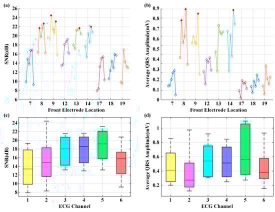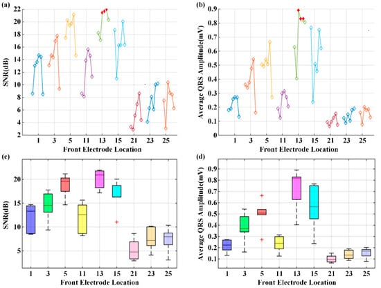 Here, we present the results of the case study for determining the optimal electrode location using a WFEES module with the L91S method. Figure 12 illustrates the results of ROI determination considering the SNR and average QRS amplitude. The ECGs were obtained from nine coarse-grained squares, i.e., squares 1, 3, 5, 11, 13, 15, 21, 23, and 25 in Figure 7, on the front side of the 19 subjects’ bodies. In each square location, there were six single-lead ECG channels, indicated as six hollow diamonds on each short line. The six hollow diamonds represented channels 1 to 6 in Figure 1, moving to the right in each short line.
