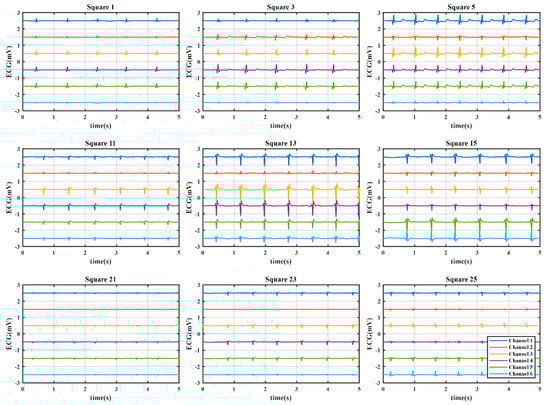 From Figure 12a,b, we could see that the square 13 provided the highest SNR and average QRS amplitude, particularly in channels 3, 4, and 5, as indicated with filled and red diamonds. To accurately determine the ROI, the distributions of SNR and average QRS amplitude for the nine coarse-grained squares were further presented in Figure 12c,d, respectively. On each box in these figures, the central mark was the median, the edges of the box were the 25th and 75th percentiles, the whiskers extended to the most extreme data points not considered outliers, and outliers were plotted individually. It is obvious that both SNR and average QRS amplitude of square 13 had the best distributions. Figure 13 presents the typical six-channel ECG signals of the coarse-grained squares on the human body. We could also find by observation that the quality of ECG signals from square 13 was relatively better than those from other squares. Therefore, square 13 was determined to be the ROI in our case study.