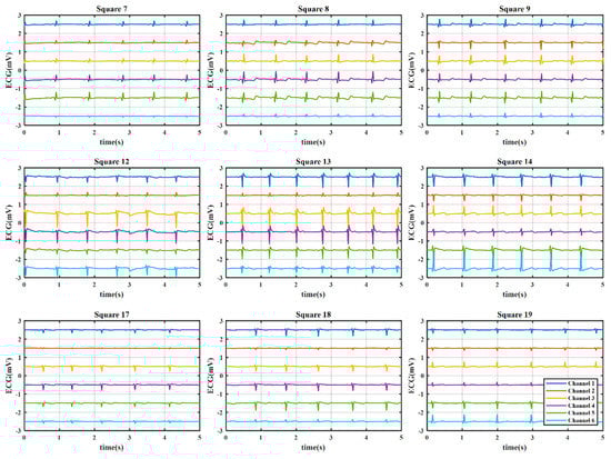 In this case study, 19 young (average age of 24.6 years), healthy subjects (12 males and 7 females) with no evidence of cardiovascular disease volunteered to participate. The WFEES was mounted on each square determined in Section 2.3.1, and we recorded 1 minute of ECG data for each square on every subject, and evaluated signal quality offline. During the experiment, all subjects were required to keep calm and sit in a chair to keep the skin–electrode interface stable.