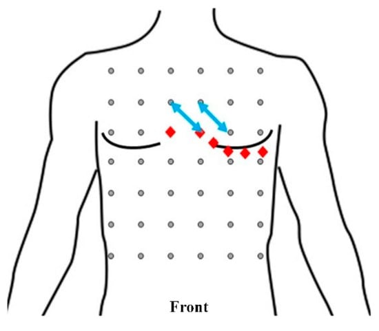 In the case study, to determine the optimized location and orientation for single-lead ECG monitoring devices, we collected ECG data and analyzed them in terms of three metrics: SNR of the signal, average QRS amplitude, and CV of QRS amplitude. According to the experiments, the best locations and orientations for single-lead ECG monitoring devices to collect ECG signals for arrhythmia diagnosis were electrode pairs 10/17 and 9/16, as marked by blue arrows in Figure 16. Electrode pair 10/17 was above the chest electrodes of standard precordial leads V2 to V4. Electrode pair 9/16 was above the chest electrodes of standard precordial leads V1 and V2.
