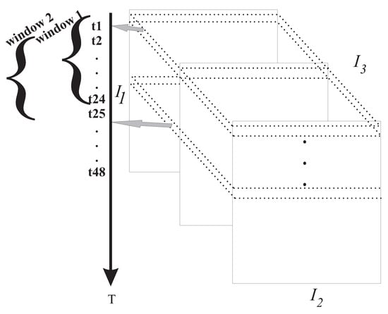 To model the data to use the multidimensional HOSVD method (), we organized the set of all multivariate observations in a third-order tensor , where corresponds to the time dimension, the sensed variables, and the cities analyzed. Therefore, each matrix (in total, three multivariate observations series representing a respective city) is considered as a slice of tensor . Therefore, through a sliding window, an observation model of the most recent flow data is generated, as presented in the following section.