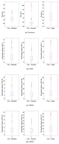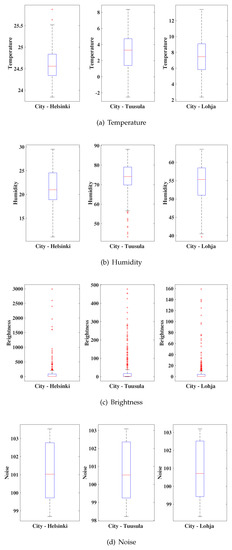 The boxplots of the real values collected by the sensors of the platform Smart Citizen of the cities of Helsinki, Tuusula, and Lohja are presented in Figure 2 and Figure 3. We considered outdoor sensors for a period of 16 days (December 1 through December 16, 2018), totaling a bank of 381 h of monitoring of the eight environmental variables. These locations were selected because they offer online sensor nodes where measurements can be performed in real time without missing data.