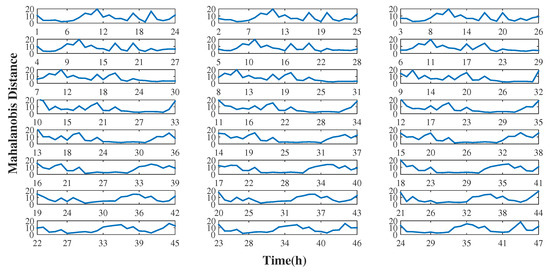 The idea behind the sliding window is to process the data in smaller batches at a time, usually to represent a neighborhood of points in the data. Therefore, using a fixed band of 24 h we updated the data every hour, that is, as new data arrived at a given instant, the method was updated. The choice of updating the sliding window every hour over a fixed 24 hour window was decided, as it was determined that with an increase in this period, the shorter peaks can be eliminated and the outliers can be camouflaged. That is, if the window is too large, the window may contain outdated information, and the accuracy of the model decreases [33]. Thus, from the results of the tensor decomposition, we analyzed the temporal dimension once we focused on the analysis of the time series of the model. Figure 4 presents online monitoring models in which every hour, that is, with each moment in which new data arrive, the decomposition of the multidimensional model is updated. Thus, our sliding window moves along a fixed window of 24 h, and throughout this window, the data are updated with a granularity of 1 hour until the entire time series is contemplated, where we observe throughout the process the dynamics of the temporal behavior of the data and its effects on the rest of the sliding window band as it moves. For example, Figure 4 presents online monitoring for the first and second day and the change in the dynamics of temporal behavior as new data are incorporated into the multidimensional model. For a better understanding, the first subplot of Figure 4 shows the first 24 h considered in the model analysis, then the window moves (moving to the second day) every 1 hour, and as a new die enters, the last die of the time series is discarded, and so the model is updated. This process is repeated until the entire time series is contemplated.