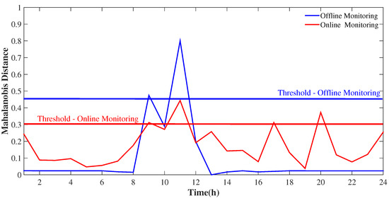 For a better visualization, Figure 5 shows the first subplot of Figure 4, where we observed online monitoring (with the sliding window) and added a comparison with offline monitoring for the first 24 h monitored, in addition to establishing detection limits for each. We observed that online monitoring through the sliding window (red line) identifies a greater number of peaks, pointing to a greater variation in data dynamics than in relation to offline monitoring that identifies only a single more expressive valley with its respective two peaks (blue line). As valley points are surrounded by two larger neighbors (immediately anterior and posterior), this result corroborates the hypothesis that offline monitoring does not represent a good approximation of data for monitoring, unlike online monitoring that represents a better approximation of these points revealing the granularity of the outliers. This is because unlike traditional data mining, which can read time series static over and over again, each sample in a data stream is examined along the sliding window [33].