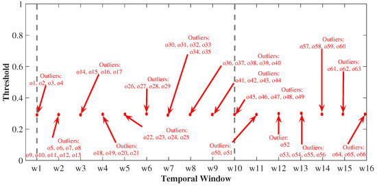 Thus, to identify outliers we applied the function to reduce dimensionality and discover possible associations between the components of the multiway tensor. After dimensionality reduction, the function was applied for outlier detection. Within this function we embedded the sliding window method to capture the continuous changes of the similarity statistical characteristics in a timely and rapid manner. The central idea was to obtain from the composition of the two functions () an improvement in the detection accuracy in online monitoring. Then, as the window moves the entire process of multidimensional data decomposition is performed for each sample unit considered in the time series under analysis, the Mahalanobis distance is calculated, and a threshold is generated for each detection result.