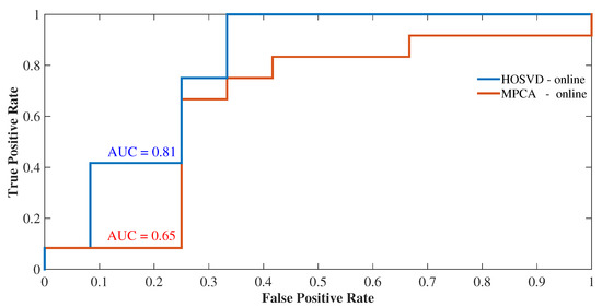In this subsection, we discuss the methods used to evaluate the performance of online outliers detection. We evaluated the performance of multidimensional approaches, HOSVD online and MPCA (Multilinear Principal Component Analysis) online methods concerning the receiver operational characteristic (ROC). In addition to that, an approach to evaluate the statistical significance of an ROC curve is to calculate the area under the curve (AUC). Thus, the results shown in Figure 8 exhibit an even higher AUC (0.80 in the picture) for HOSVD online and a lower, AUC (0.65 in the picture) for MPCA online. The curves also reveal that because the AUC for online MPCA is smaller than the AUC of HOSVD online, this phenomenon corroborates the results found for the online HOSVD method that detected a larger number of outliers. Although the gain found for the online HOSVD method of 0.80 accuracy approached the accuracy of the method proposed by Souza et al. [18], 0.87, this result points out that our online method can achieve more significant gains once it is combined with clustering algorithms such as k-means. Therefore, we observed that the HOSVD tensor decomposition method combined with the sliding window detection in online monitoring is established with greater precision. This phenomenon can be gauged by the fact that in this configuration, the data structure is richer in information than when the data are unfolding for the application of the MPCA method.