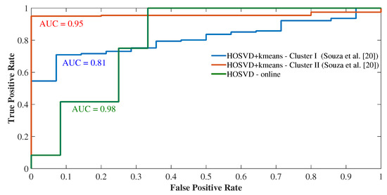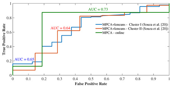 Again, we performed a performance comparison using the ROC curves, this time between the proposed online methods and the offline methods used in [18]. For this, we compared the outlier detection performance in both clusters I and II for both offline HOSVD+kmeans and MPCA+kmeans methods compared to HOSVD and MPCA online detection methods. Figure 9 shows the ROC curves, where a greater accuracy was found for the online HOSVD method compared to the HOSVD + kmeans method, with an accuracy of 0.98. The same pattern of superiority of the MPCA online method was observed when compared to the offline MPCA+kmeans method, with an accuracy of 0.73 (Figure 10). Therefore, we observed that the online methods presented supremacy over the offline methods, both in Figure 9 and Figure 10. Moreover, this phenomenon of the superiority of the online HOSVD method over the MPCA method is due to the fact that the HOSVD model presents a richer three-dimensional information structure, since the MPCA method has its data structure matrixed in mode 1. That is, the decomposition of the MPCA method occurs over a two-dimensional structure, whereas the HOSVD decomposes the data considering the three analyzed dimensions (time, measurements and space).