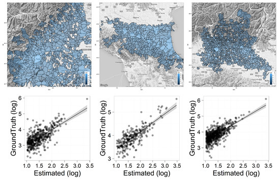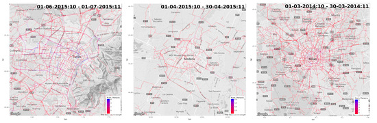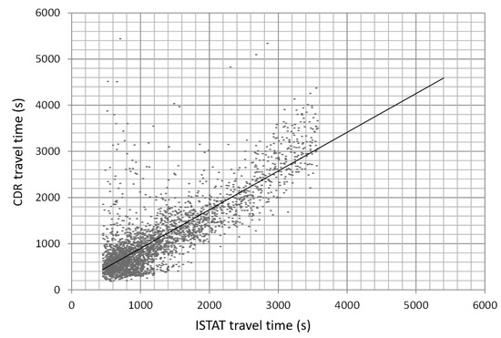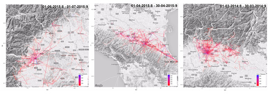 - Routine-based matrices (rOD, or OD by purpose) focus on routine movements like home-work commute [8]. They are computed from a trip-generation model estimating routine movements for each person in the area on a given day at a given time. On this basis, they are computed by aggregating all the routine movements that are assumed to take place at that time. The main advantage of these models is that they involve the whole telecom operator market share and it is relatively easy to scale up the estimates to the whole population. The main disadvantage is that they represent the “modeled” flow for that routine, and thus they cannot easily cope with the peculiarities of a given day.