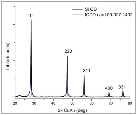 From the X-ray diffraction (XRD) (Figure 2) made on the obtained powder by PLD, the presence of specific peak only for Si was noted (ICDD 00-027-1402) with a lattice constant of 0.54377 nm, almost identical to the standard, which is 0.543088.
