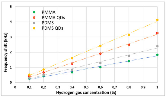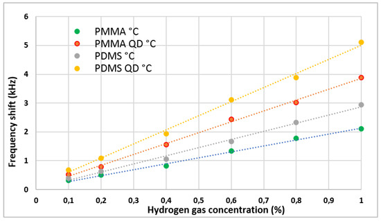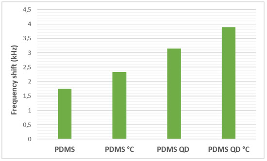 In order to further analyze the degree of influence of the presence of QDs and of the heat treatment, Figure 6 presents the results of the frequency shifts for the sensors with PDMS at a hydrogen concentration of 8%. As can be seen, the heat treatment on the polymeric film of PDMS led to an increase in frequency shift of 0.58 kHz (about 20%). The addition of QDs in the PDMS film, however, led to an increase of 1.4 kHz, which is about two times higher than the increase observed when only the heat treatment was applied on the film (40%). When both methods of sensitivity enhancement were applied, the frequency shift increased by about 2 kHz, which means an increase of about three times greater (55%) than the increase observed when improving only with heat treatment. As a conclusion, QDs have the greatest contribution to the improvement of the sensitivity of the sensors and the heat treatment is an important parameter that helps to improve the sensors’ performance.