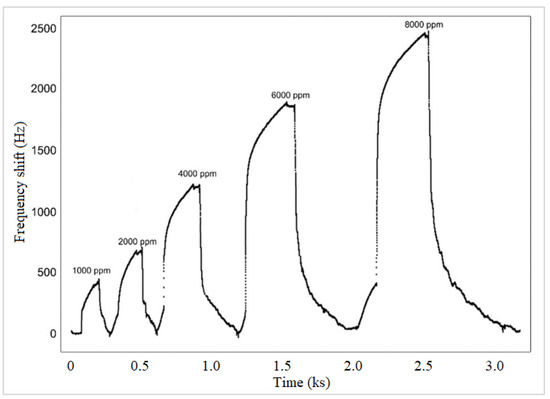 Figure 7 shows the dynamic response of the PMMA QDs sensor at different analyte concentrations. As can be seen, the sensor is reversible both at lower concentrations and at higher concentrations. When polymers are used in this application, the reversibility property is very important because they can react through the functional groups with the gases to be tested. Repeating 10 measurements of the frequency deviation for each sensor, at the same concentration, yielded errors below ±3.7%.