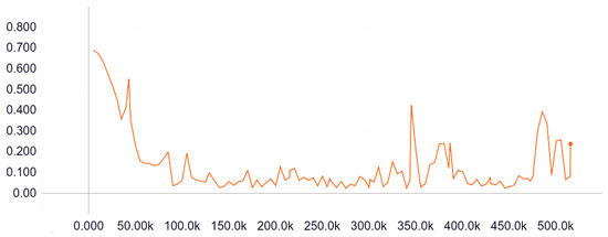 Our system has been implemented in Keras [28] using Tensorflow as backend [29]. As mentioned in previous sections, our model input is the result of the concatenation of the reference and the foreground image along the depth axis. The model output is conformed by a vector with a length of 4096 elements. To obtain this desired structure, we have to process our original ground truth images. These images are provided by the CD2014 Dataset as a grayscale image. Black pixels represent unmodified regions. White pixels depict altered zones and grey indicate the border between an altered and an unaltered zone. The image processing has been performed using the ImageDataGenerator class from Keras and Numpy [30]. ImageDataGenerator allows Keras to select batches of data for training the model, instead of loading the complete dataset on memory and select the batches from memory. As a result, we obtain an iterative component called generator. These generator structures are widely implemented in Keras, and training methods are no exception. With this methodology, extensive datasets are easy to handle. These generators can be easily customized. In our case, we have performed two significant customizations. First, we have concatenated both input images into a unique structure with size of 64 × 64 × 6 as our model input. Then, output images are transformed into vectors using Numpy API. Final dataset is detailed on Table 3. In summary, the training dataset is conformed by 130,476 patches, 43,492 for background, foreground and ground-truth respectively, with a proportion of 80% for training and 20% for evaluation purposes. 6750 additional patches from the IOM category have been included for metrics evaluation. Training loss is illustrated in Figure 5. The X-axis represents the steps (in thousands) of training. The Y-axis depict the loss value at a given step. The graph has been obtained using Tensorboard from TensorFlow. Tensorboard has been employed to analyse the training process. The model has been trained on an NVIDIA 1080TI GPU for 12 epochs because of the implementation of early stopping [31].