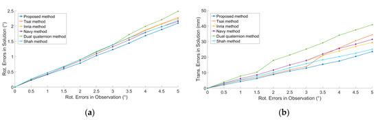 Gaussian rotation noise (μR = 0, σR = 0°–5°) and translation noise (μT = 0, σT = 0–5 mm) were added into Ai and Bi (i = 1, 2, …, 9, 10). We ran 100 simulations at each noise level. The results were shown in Figure 3, in which ‘Rot.’ represents ‘Rotation’ and ‘Trans.’ represents ‘Translation’. Except for the dual quaternion method, translation perturbation had no effect on the rotation solution, because only the dual quaternion method solves rotation and translation simultaneously, whereas other methods solve rotation and translation by steps.