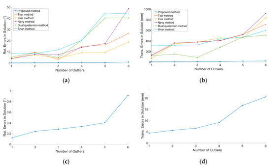 The simulation conditions were σR = 0.2°, σT = 2 mm, and ε = 0.01. The robot gripper moved 10 times, in which large noise was added into n (n = 1, 2, 3, 4, 5, 6) movements randomly and these observations were regarded as outliers. We ran 100 simulations at each number of outliers. Figure 5a,b shows the relationship between calibration errors of RX and tX and the number of outliers, respectively. Figure 5c,d depicts the performance of the proposed method. The results indicate that the proposed method can detect outliers effectively and performs much better than the other five methods.