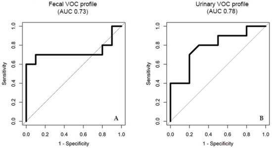 (A) Receiver operating characteristic (ROC) curves display the ROC curve for the fecal VOC profile, and (B) displays the ROC curve for urinary VOC profile for the discrimination of IBD from controls. Abbreviations: AUC, area under the curve.