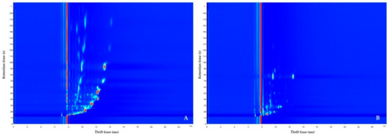 Examples of GC–IMS output. Here, the GC-IMS of fecal (A) and urinary (B) VOC profiles of one IBD patient are displayed. On the y-axis, the retention time indicates the separation time of the analyte by means of gas chromatography. The color represents the VOC concentration using color spectrum from blue to red, indicating low concentration to high concentration, respectively.