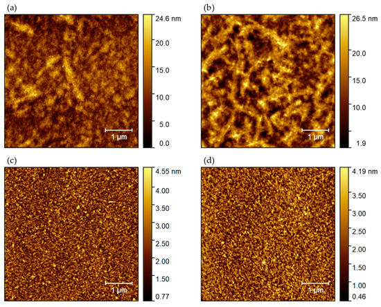 AFM topography maps acquired in tapping mode of P3HT deposited on Si/SiO2 substrate (a) from toluene solution without adhesion promoter, (b) from toluene solution with Ti prime, (c) from oDCB solution without adhesion promoter, and (d) from oDCB solution with Ti prime.