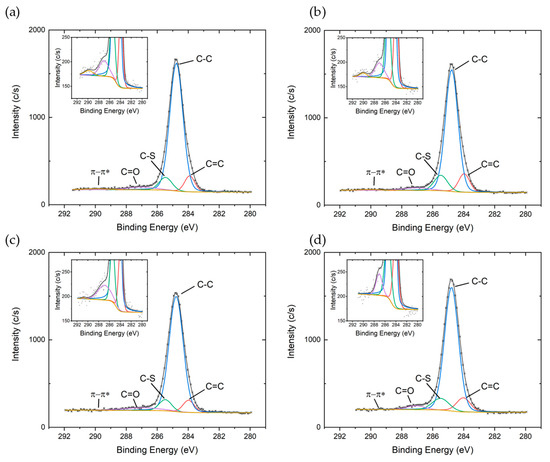 C1s peaks (Figure 2) were deconvoluted with five components: the main component around 284.80 eV accounting for C–C bond atoms in in the alkyl side chains, two components around 284.00 eV and 285.50 eV accounting for C=C and C–S bonds in the thiophene ring respectively [22,23], a fourth component at around 2.5 eV higher binding energy with respect to the main one, related to carbonyl group [24] most probably formed due to incorporation of oxygen impurities during fabrication process, and a fifth component around 289.90 eV attributed to transitions.