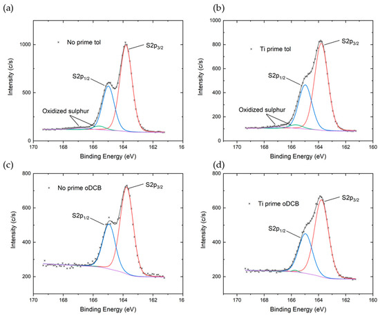High resolution S2p spectra of P3HT deposited on Si/SiO2 substrate (a) from toluene solution without adhesion promoter, (b) from toluene solution with Ti prime, (c) from oDCB solution without adhesion promoter, and (d) from oDCB solution with Ti prime.