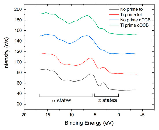 The intensity of shake-up satellites can be used to qualitatively understand the degree of delocalization of orbitals along the polymer backbones and inside the polymeric film; stronger satellite peaks are due to a less efficient screening of the core hole formed during the photoionization process and are associated with a lower degree of delocalization of orbitals [25]. When using toluene as solvent (Figure 2a,b) the area percentage associated with satellites decreases from % for the No prime tol process to % for the Ti prime tol process, suggesting that Ti Prime may slightly improve the stacking of polymer chains and reduce the conformational disorder along polymer backbones. When using oDCB as solvent, the intensity of the shake-up satellite is systematically lower than the background noise, indicating better delocalization of the molecular orbitals.