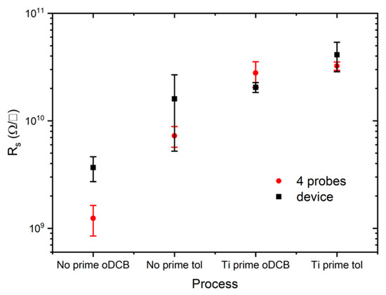 Sheet resistances extrapolated from a set of five devices for each process (black symbols) and measured with the four probes method on the other five samples for each process (red symbols). Devices fabricated starting from oDCB solution generally show higher conductivity with respect to those fabricated with toluene. Ti prime improves reproducibility but reduces the conductivity independently on the solvent.