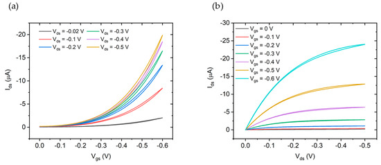 Transfer characteristics (Ids vs. Vgs) and output characteristics (Ids vs. Vds) of a device fabricated without an adhesion promoter using oDCB as solvent are shown in Figure 6a,b respectively. Transfer and output characteristics have been measured on a set of five devices for each different process using DI water as a gate electrolyte and a leak free Ag/AgCl reference electrode as a gate electrode.
