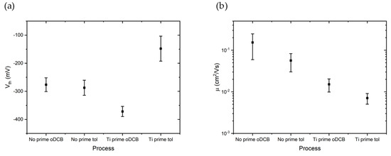 (a) Threshold voltage extrapolated from transfer characteristics of five devices for each process. (b) Field effect mobility obtained from output characteristics in linear regime of five devices for each process.