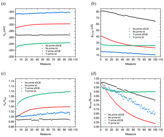 In Figure 8a,b are shown the behaviors of threshold voltages and transconductances during repeated measurements. The same quantities normalized with respect to their initial value are reported respectively in Figure 8c,d.