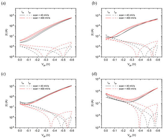 Transfer characteristics measured at scan rates of 40 mV/s (black curves) and 400 mV/s (red curves). Solid lines correspond to drain current while dashed lines are the gate leakage current. (a) No prime tol, (b) Ti prime tol, (c) No prime oDCB, and (d) Ti prime oDCB.