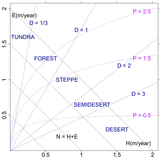 Ecohydrological state space (Stephenson’s diagram) spanned by evapotranspiration and sensible heatflux, E and H. Net radiation N, precipitation P, and the dryness ratio, D = N/P, are included employing the surface energy and water flux balance and the ecohydrological equation of state based on Budyko’s framework (units of fluxes in water equivalents of m/year; see text, Section 2).