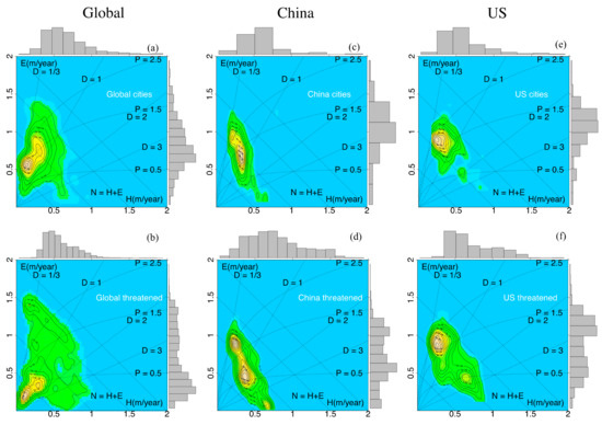 Frequency distribution of the climatological means of surface evapotranspiration E and sensible heat flux H presented in (E, H)-state space for (a,b) Globe, (c,d) China and (e,f) America cities (upper row) and threatened species (bottom row).