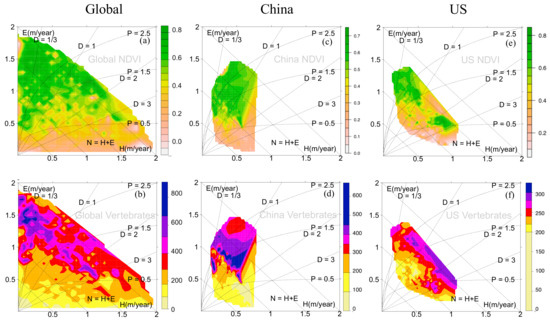 Vegetation greenness (upper row) and vertebrates abundance (bottom row) embedded in (E, H)-state space across the (a,b) Globe, (c,d) China and (e,f) America (US).