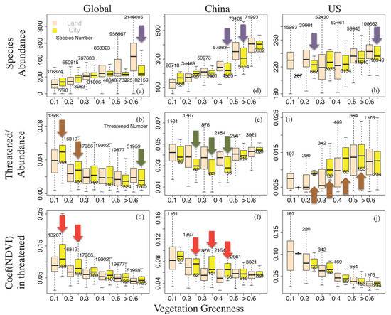 Land-city comparison for across the (a–c) Globe, (d–f) China and (h–j) America: Statistics of the species abundance versus vegetation greenness (upper row), the threatened species indicator (threatened species number/species abundance) versus vegetation greenness (middle row), and the coefficients of annual Normalized Difference Vegetation Index (NDVI) variability versus vegetation greenness (bottom row). Arrows show obvious land and city contrast, and green and brown arrows identify green/brown cities with a positive/negative effect on biodiversity, as quantified by lower/higher threatened species indicator.