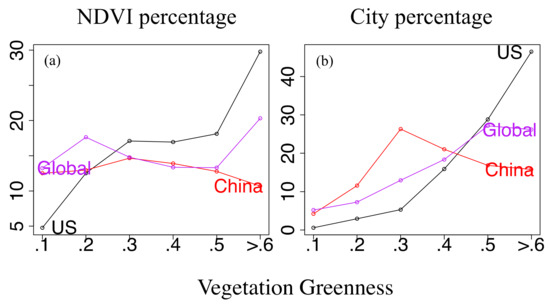 Statistics of (a) NDVI percentage (ratio of vegetation covered area (T < NDVI < T + 0.1)/area), and (b) city percentage (fraction of vegetation cover in cities area (T < NDVI < T + 0.1, light > 12)/area (light > 12)) depending on vegetation greenness for the Globe, China and America.