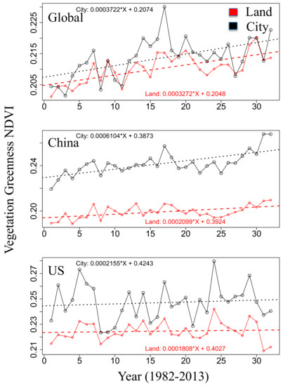 (iv) Cities in China reveal a positive city effect: They occupy an area of low to moderate greenness with potential to enhance, and reveal a trend of vegetation greenness increasing during the last 30 years, which is about three times larger for cities than land, although they are linked with an increased coefficient of NDVI-variability. A negative effect of global (American) cities occurs where both cities and land occupy an area of similar lower (moderate) greenness linked with a larger (unchanged) coefficient of NDVI-variability but share similar vegetation greenness trends of cities and land.