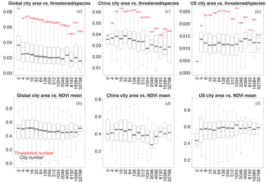 Statistics of city size versus threatened species indicator (upper row) and averaged vegetation greenness (NDVI, bottom row) for the (a,b) Globe, (c,d) China and (e,f) America. City sizes are binned into exponentially wider bins to circumvent the situation that few numbers of cities appear in large city size ranges (city size in km2).
