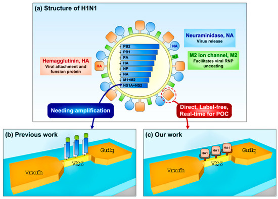 The influenza virus generally drifts as a virion through the air until it infects a host. During the infection process, it secretes a viral surface protein called hemagglutinin (HA) (Figure 1a). The influenza HA protein determines the species that can be infected by a strain, and the binding location of the strain in the human respiratory tract [35]. In the strains that are easily transmitted among people, the HA proteins bind to receptors in the upper part of the respiratory tract, such as the nose, throat, and mouth. Thus, the detection of HAs involved in the initiation of infection will most efficiently and accurately recognize the existence of viruses in the human body. HA is an antigenic homotrimeric integral membrane glycoprotein. The HA monomer consists of a topped large HA1 globule and a long, helical chain anchored in the membrane by HA2 domains [36,37,38,39]. The HA1 domain contains sialic acid binding sites, and is well known to be essential for viral infection of host cells.