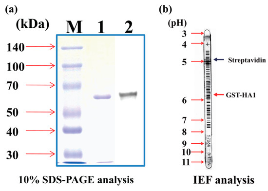 The isoelectric point (pI) of the purified protein was confirmed by the isoelectric focusing (IEF) analysis with the control protein, streptavidin (Figure 2b). Streptavidin showed pI = ~5, while the purified HA1-GST showed pI = ~6 in the IEF analysis of the purified HA1-GST.