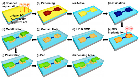 The sensing area on the SiNW parts was opened by removing the TEOS passivation oxide via MERIE in CHF3/CF4 plasma. The biomolecule analyte in the aqueous environment can be detected by means of contacting the SiNW surface with the analyte through the removal of the oxide layer on the SiNW part. Finally, the alloy process was conducted to remove the dangling bonds and complete the whole process (Figure 3k).