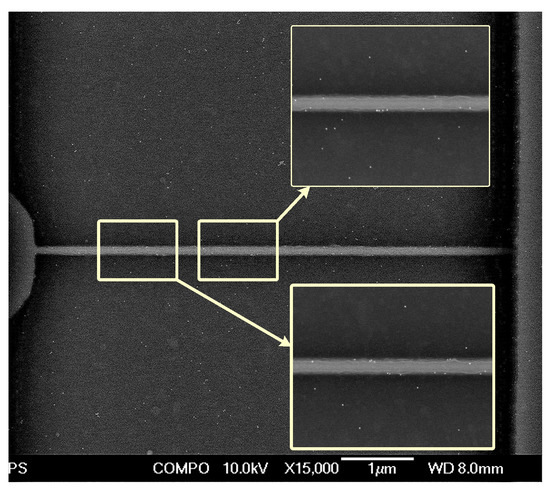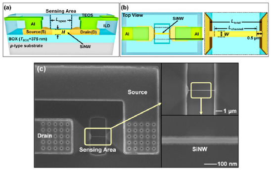 Figure 4 shows the schematic view (Figure 4a,b) and the scanning electron microscope (SEM) image (Figure 4c) of the fabricated SiNW FETs. The height, channel length, length of the open sensing area, and total length were H = 70 nm, Lopen = 2 µm, and Lchannel = 1 µm, respectively. Lchannel depicts the separation between the S/D metallurgical junctions, and is effectively determined from Lopen and two offsets of 0.5 μm (Figure 4b). The SiNW width W was varied from 30 to 400 nm through e-beam lithography. Figure 4c shows the case of W = 30 nm.