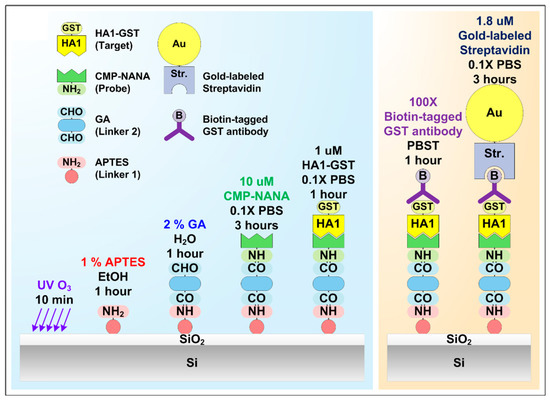 Figure 5 shows the scheme of the surface functionalization and immobilization of CMP-NANA and HA1 (left panel). First, after constructing the PDMS microfluidic channel, the device was treated by UV O3 for 600 s to introduce more hydroxyl (–OH) groups on the Si oxide surface, which is a well-known SAM method employing surface amine and aldehyde modification, and is for the specific binding of the amine group of CMP-NANA to SiNW [40]. APTES (first linker) and GA (second linker) were then sequentially applied and followed by the interaction with CMP-NANA. The device was functionalized by exposing the surface to 1% APTES in 95% ethanol for 1 h to form the SAM with the aldehyde group on the native oxide surface of the SiNWs. It was then washed with ethanol and dried with nitrogen and heated on a hot plate for 10 min at 120 °C. After the formation of the amine-terminated SAM by the preceding process, 2% GA in deionized water was coupled to the NH2 surface of the SiNW for 1 h, followed by a thorough washing with deionized water. GA was chosen as the second linker because it has two aldehyde groups in its top and bottom; therefore, it can bind individually to all the amine groups of APTES and CMP-NANA (left panel, Figure 5).