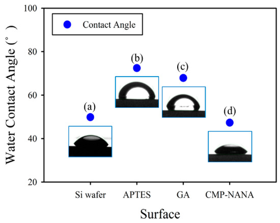 The contact angle of each step was also observed during the surface modification processes, and the well-modified surface was confirmed. The contact angle of the bare Si wafer with native oxide was 49.8° and changed into 72.4° (after APTES functionalization), 67.8° (after APTES/GA functionalization), and 47.3° (APTES/GA/CMP-NANA immobilization) (Figure 6). The changes in the contact angle indicated that the functional groups were adequately modified. We now finally confirmed the surface immobilization of CMP-NANA.