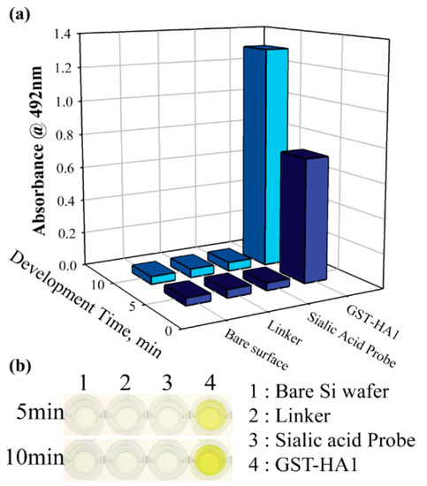 ELISA of functionalized Si wafer. (a) Absorbance was measured at 492 nm after sequential functionalization of Si wafer; bare surface, surface immobilized with linker (APTES and GA), surface functionalized with CMP-NANA, and addition of HA1 domain to the surface of functionalized CMP-NANA. (b) Color changes of terminated reaction with 2 N H2SO4 in 96-well plate.