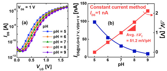 (a) Transfer characteristics of SiNW FETs with varying pH values. (b) the pH-dependencies of the drain-to-source current (IDS) and ΔVT in SiNW FETs. The sensitivity of ΔVT = 51.2 mV/pH was comparable to the Nernst limit.