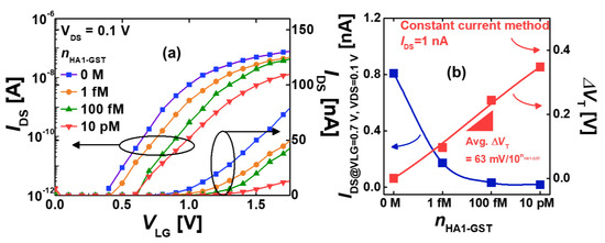 Figure 10a shows the measured transfer curves of the SiNWs with W = 70 nm at VDS = 0.1 V depending on the HA1-GST concentration (nHA1-GST). The case of 0 M suggests the condition that only the PBS solution was flowing through the microfluidic channel. The transfer curve was clearly shifted to a positive VLG direction with the increase of the HA1-GST concentration. The observed shift was very consistent with the pI value ~6 of HA1-GST (Figure 2b) considering the pH value = 7.4 of the PBS solution because the used SiNW operated in the n-type accumulation-mode FET. SiNW effectively felt a larger amount of negative charges and depleted more and more electrons as the HA1-GST concentration increased, resulting in the current decreasing and the FET threshold voltage increasing to a positive VLG direction.