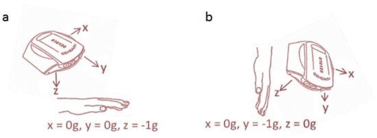 Orientation of the GENEA/GENEActiv axes when worn on the non-dominant wrist with the hand (a) level and (b) hanging vertically.