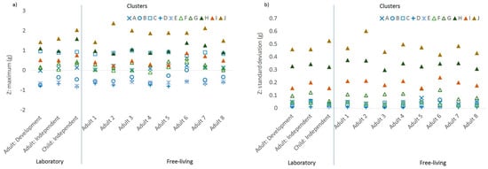 Characteristics of the acceleration features with the highest loadings by cluster and by sample, time domain: (a) maximum acceleration in the Z-axis and (b) standard deviation of acceleration in the Z-axis.