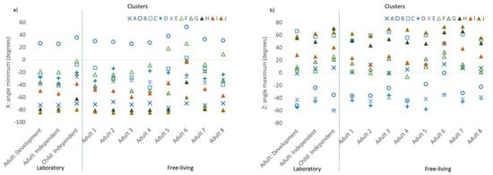 Characteristics of the acceleration features with the highest loadings by cluster and by sample, accelerometer orientation features: (a) minimum angle of the X-axis acceleration relative to the horizontal plane and (b) maximum angle of the Z-axis acceleration relative to the horizontal plane.