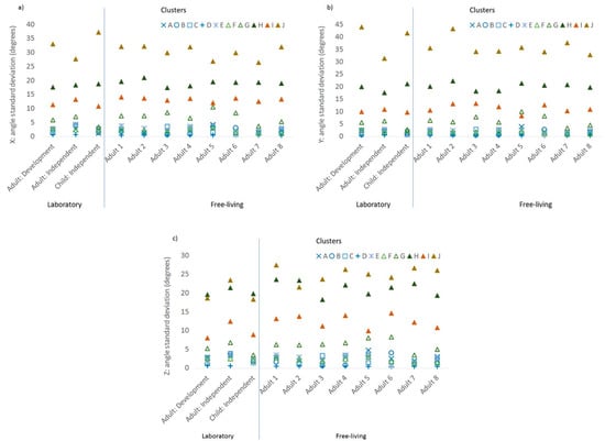 Characteristics of the features with the highest loadings by cluster and by sample, standard deviation of the accelerometer orientation metrics: (a) X-axis acceleration relative to the horizontal plane, (b) Y-axis acceleration relative to the horizontal plane, and (c) Z-axis acceleration relative to the horizontal plane.